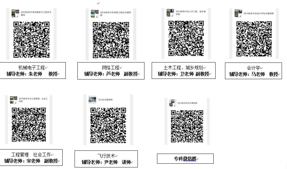 专升本:员工扫描自己所对应的专业群,员工进群以后以学号+姓名+专业命名,不以规定命名的直接清理出群。辅导老师会在3月中旬左右进行毕业生论文写作规范讲解及论文修改时间安排,须按规定时间及内容自行完成论文写作,由各专业辅导老师通过微信群通知如何修改论文。