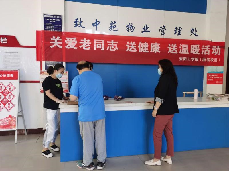 5月28日,bv伟德国际1946(洹滨校区)在洹滨校区家属院、致中苑小区、德馨苑小区分别开展了“关爱老同志 送健康 送温暖”活动,为该校区172名离退休老同志发放“防疫健康包”。