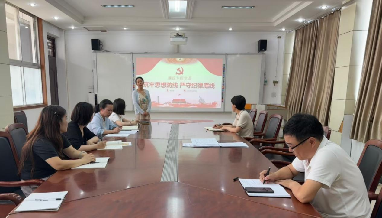 6月13日,bv伟德国际1946直属党支部书记杨聪聪以《筑牢思想防线 严守纪律底线》为题在二楼会议室为全体教职工党员讲授廉政党课。