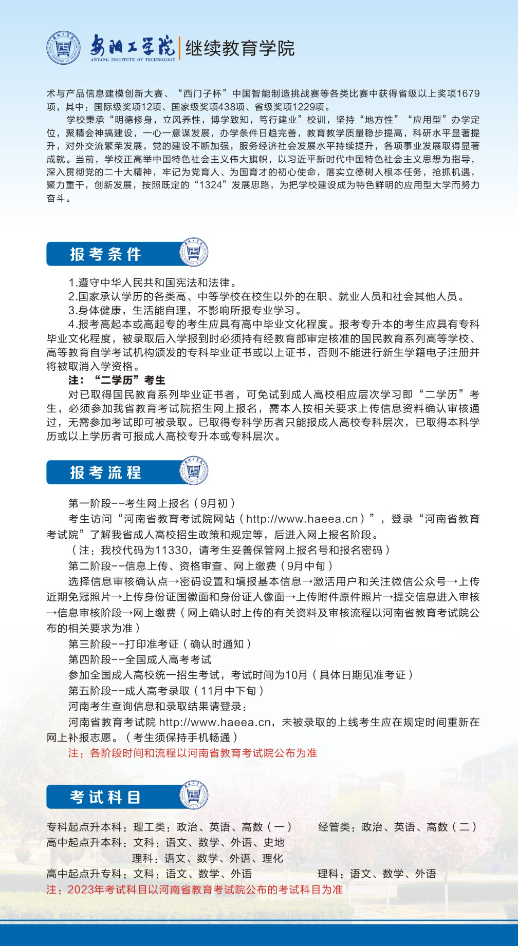 上一条:2024年高等学历继续教育招生简章 下一条:河南省教育厅关于做好2022年成人高校招生工作的通知